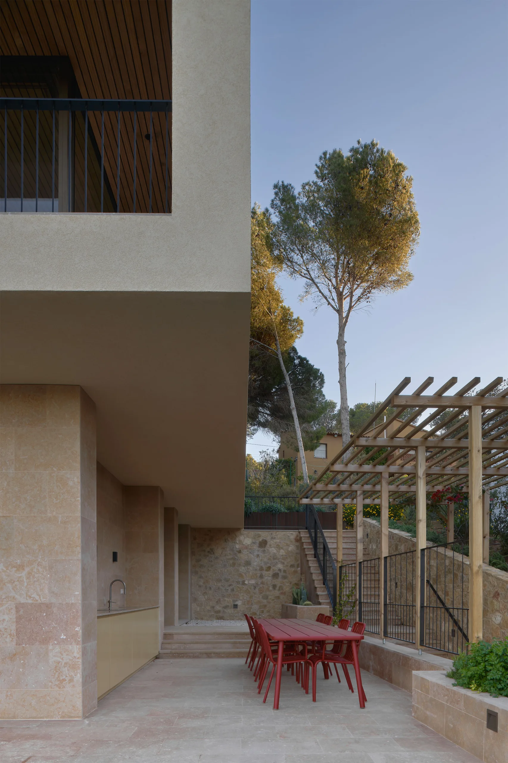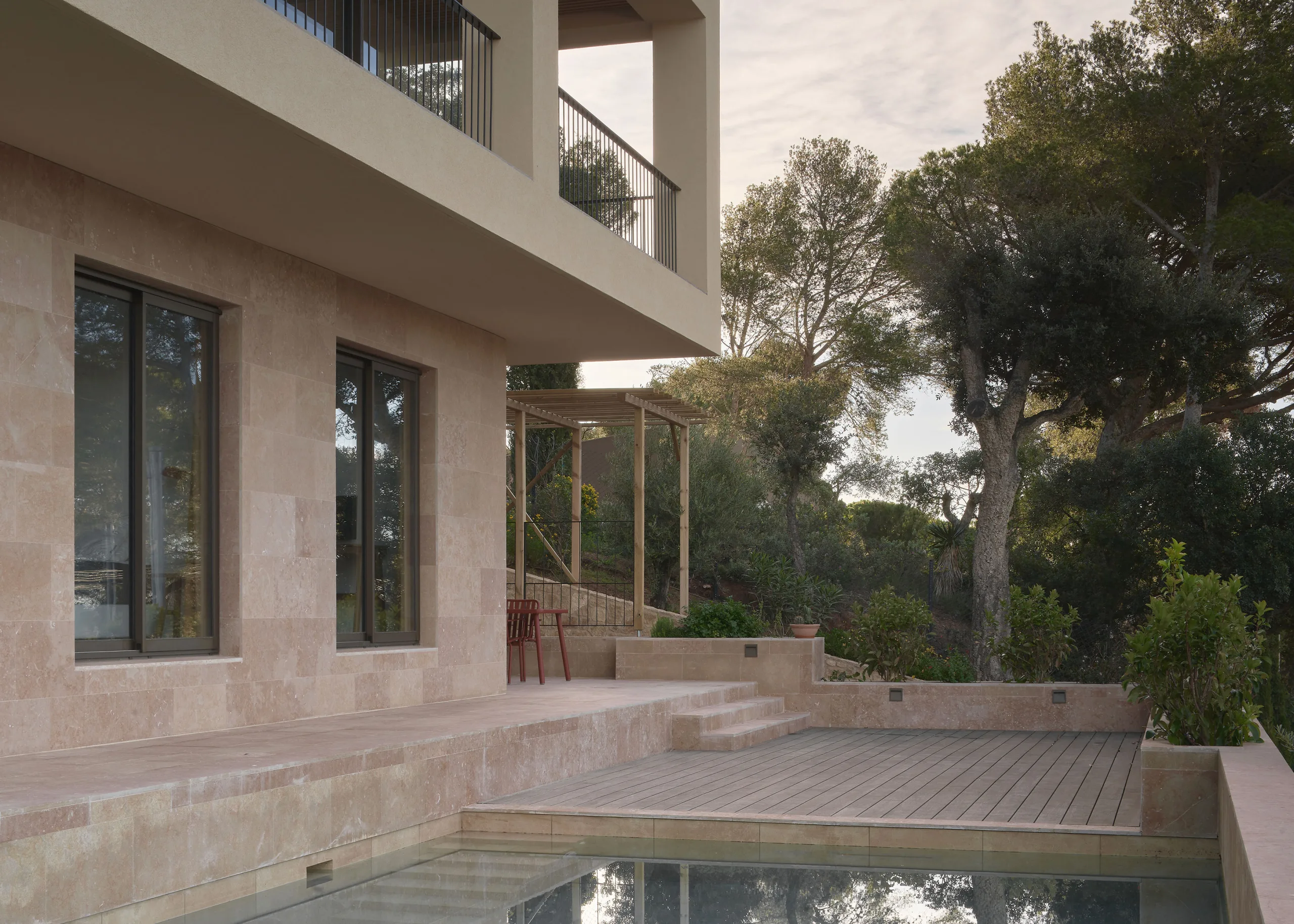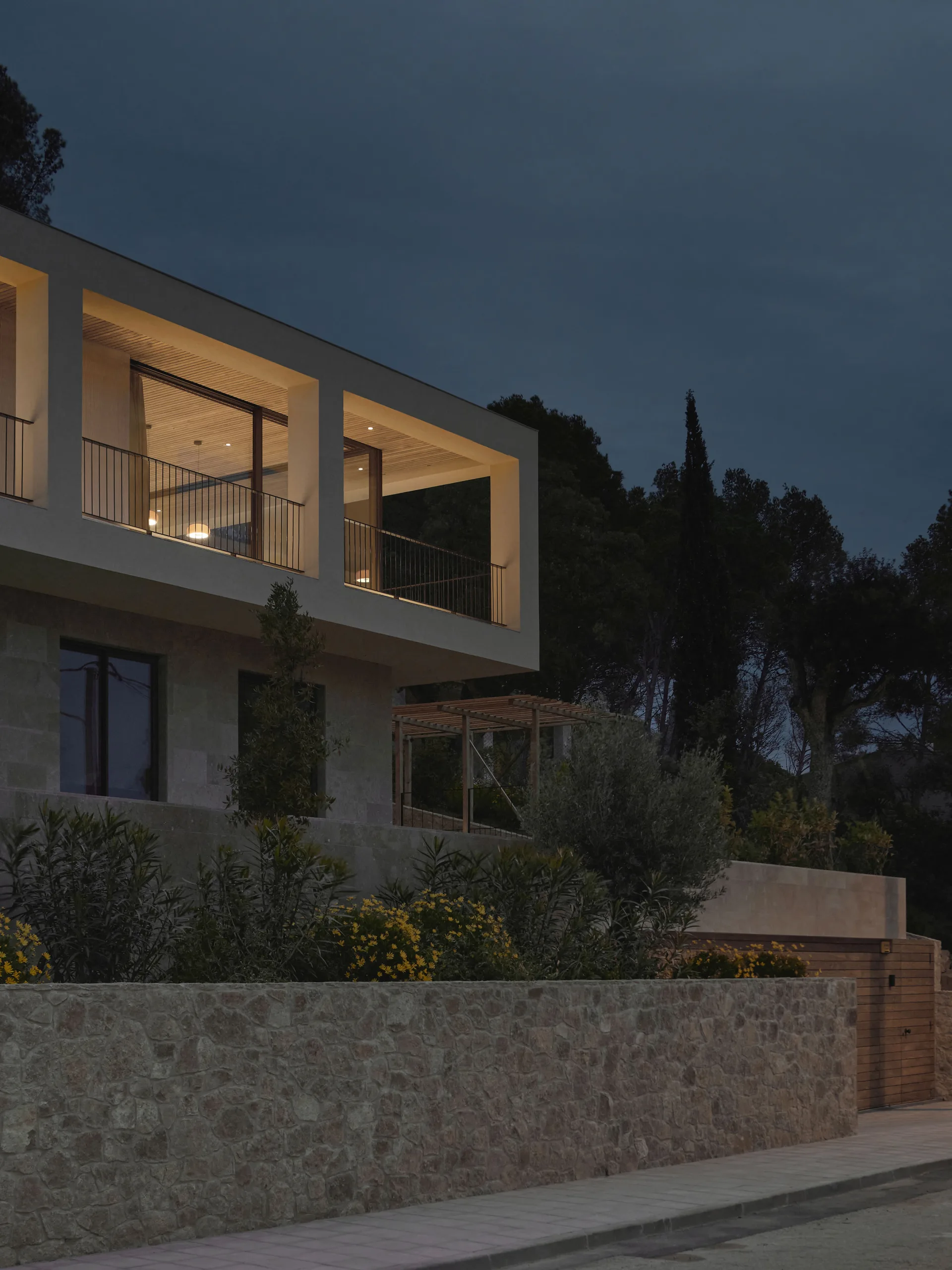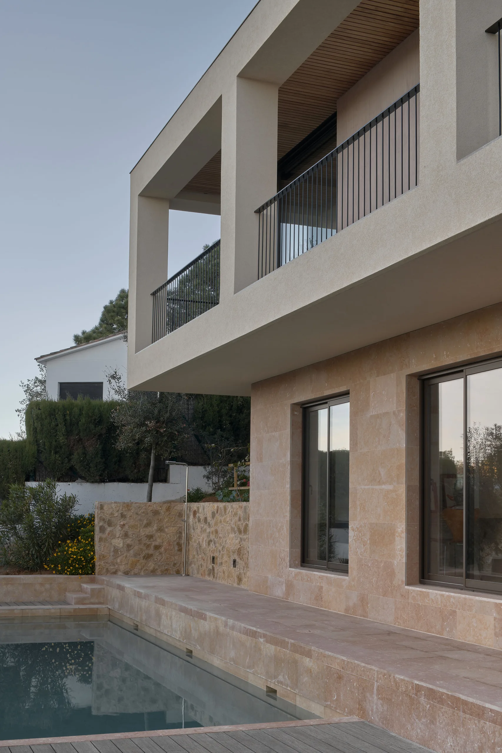 The villa is placed like a solid monolith in the sloping landscape. The natural colours and materials ensure optimal integration into the Spanish landscape. The basis is formed by a sand-coloured natural stone from a quarry near Ulldecona, some 300 kilometres south on the Spanish coast of Tamariu. The terraces and the facade of the first floor are cladded with natural stone. Equal treatment of all surfaces makes the plinth of the villa appear to be gouged out of the rocky mountains. The facade of the cantilevered floor is entirely finished with a coarse plaster, in the same colour tone as the sand-coloured natural stone. By applying different materials, a subtle transition is created which makes the cantilever seem to float. The light sand colour is complimented by aluminium window frames with a dark bronze hue and elements of dark brown wood.