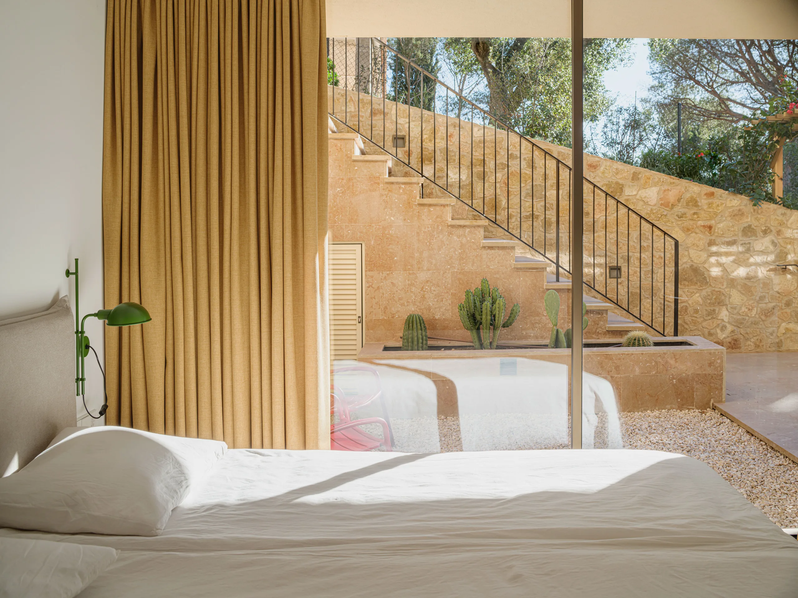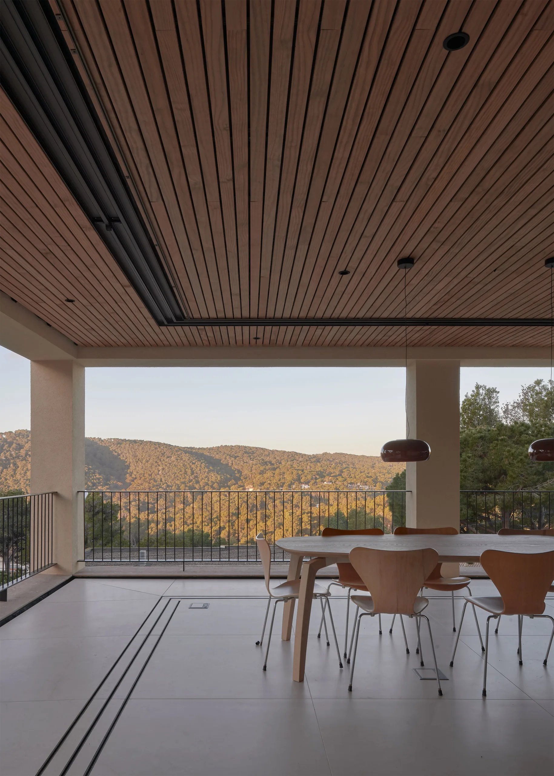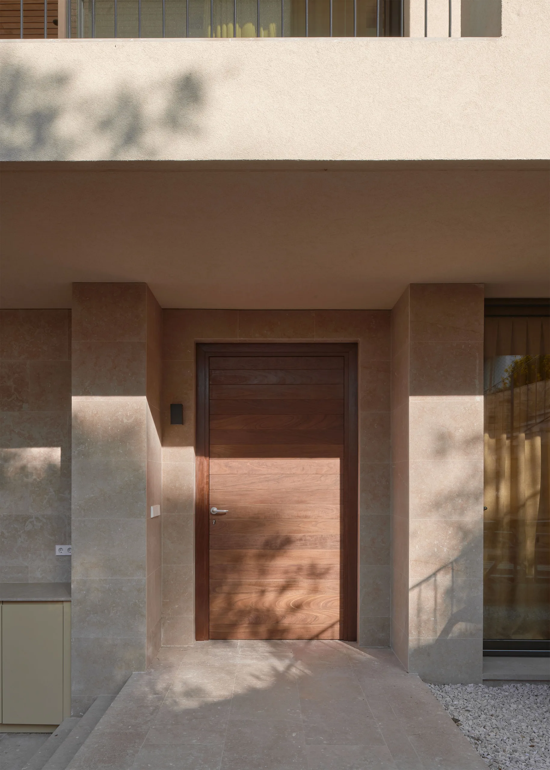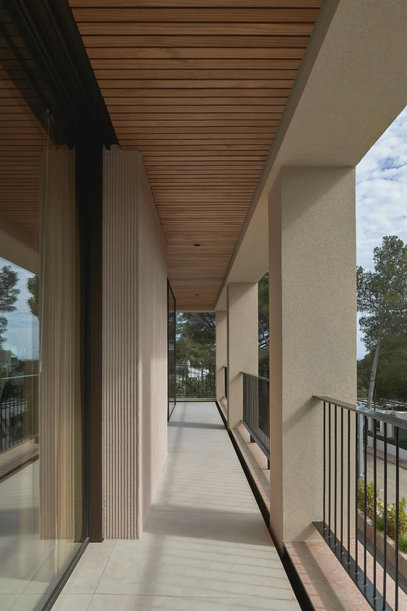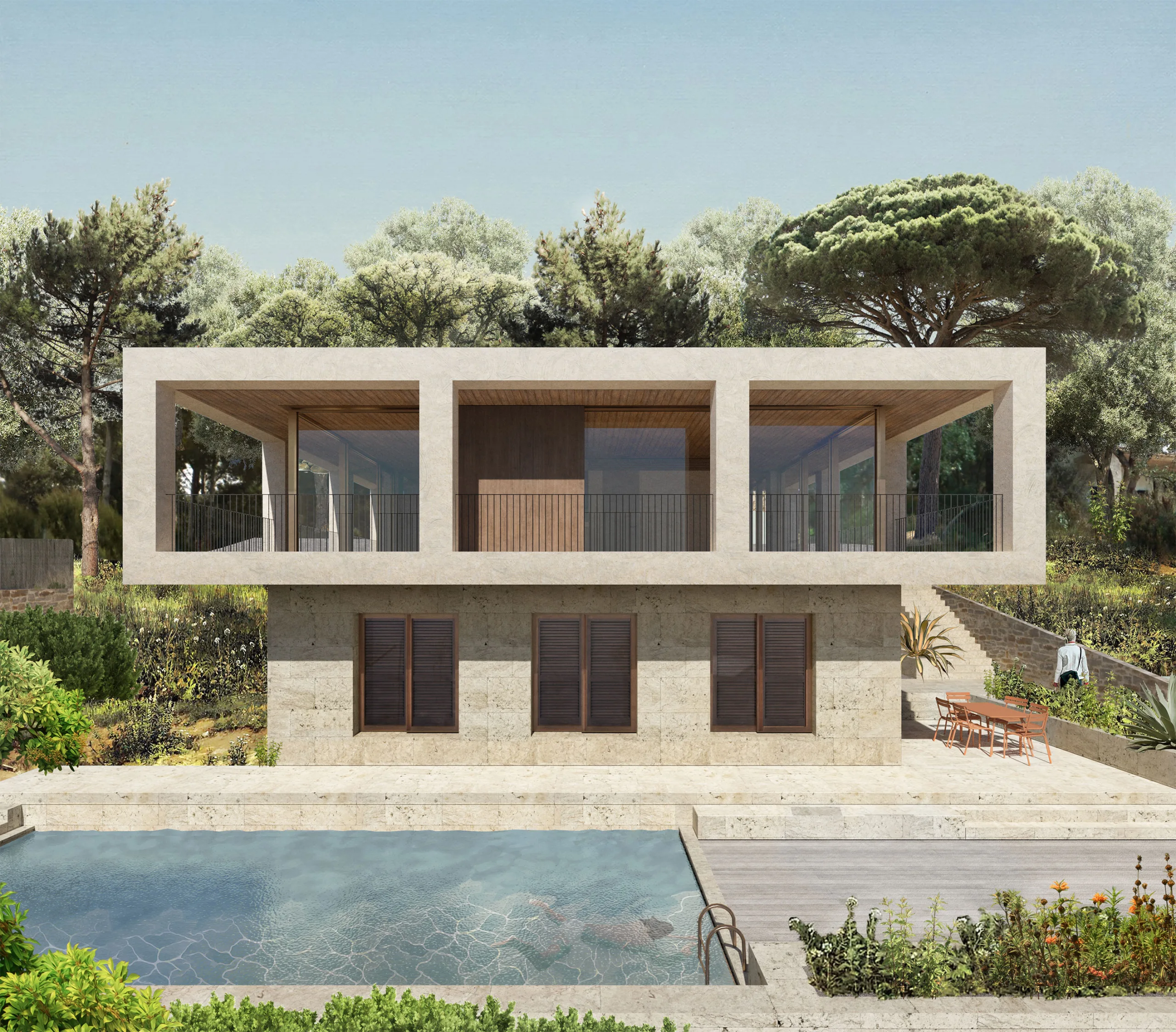 The villa is placed like a solid monolith in the sloping landscape. The natural colours and materials ensure optimal integration into the Spanish landscape. The basis is formed by a sand-coloured natural stone from a quarry near Ulldecona, some 300 kilometres south on the Spanish coast of Tamariu. The terraces and the facade of the first floor are cladded with natural stone. Equal treatment of all surfaces makes the plinth of the villa appear to be gouged out of the rocky mountains. The facade of the cantilevered floor is entirely finished with a coarse plaster, in the same colour tone as the sand-coloured natural stone. By applying different materials, a subtle transition is created which makes the cantilever seem to float. The light sand colour is complimented by aluminium window frames with a dark bronze hue and elements of dark brown wood.