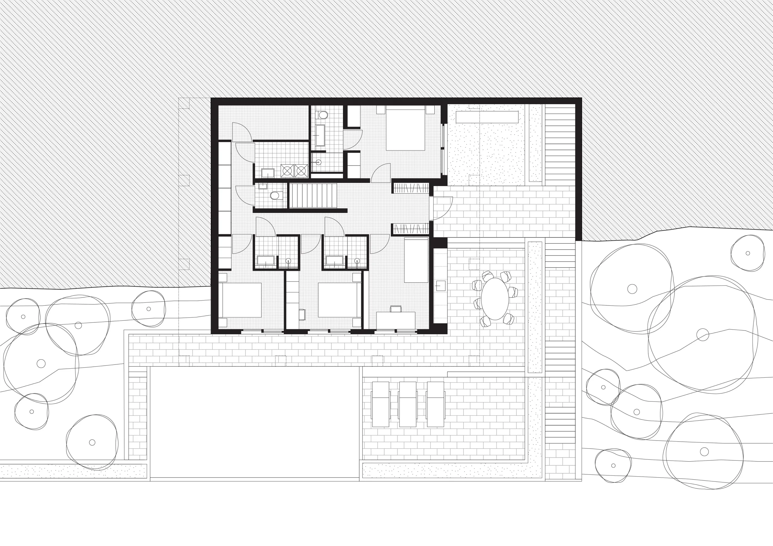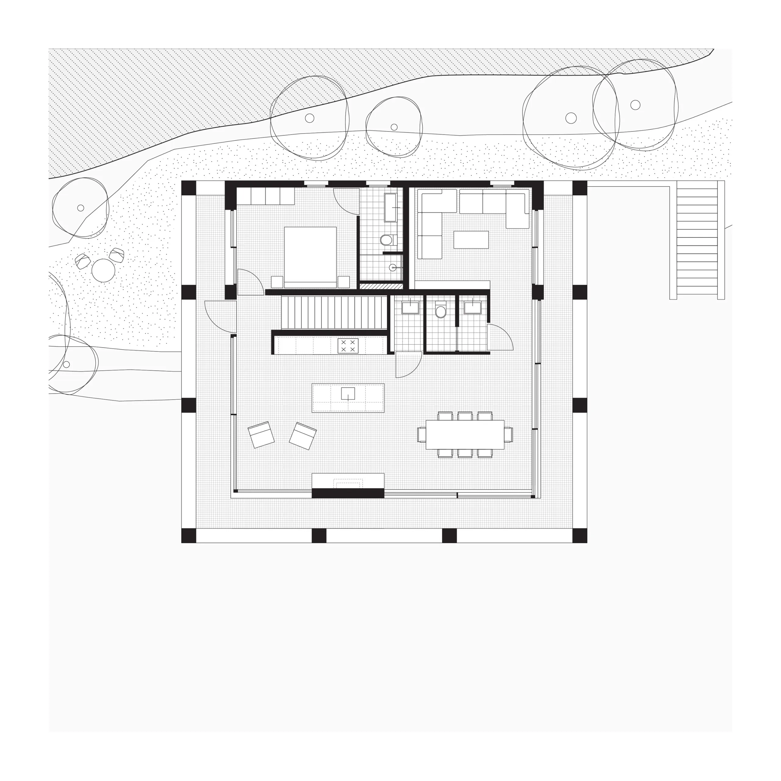 The ground floor is partly pushed into the mountain and mainly accommodates sleeping rooms and technical spaces. The villa can accommodate as many as 10 people. The staircase leading up to the entrance on the east side of the plot continues from street level to the green back garden of the plot. The staircase cuts through the landscape in a straight line. On the west side however, the landscape gently slopes like a green hillside against the bottom of the cantilever. The main entrance to the villa is not on the front but rather on the east facade, halfway up the stairs so the outdoor sitting area is not crossed when entering the villa. Different types of outdoor spaces are aligned along the villa and separated by subtle height differences. The outdoor spaces are bordered by a planter that acts as a railing and green planter at the same time. The outdoor terrace is complimented by an outdoor kitchen, which is integrated into the facade. Here, too, the continuous circulation space has a logical conclusion: in the lowest part of the terrace, along the south façade, lies a spacious swimming pool for hot summer days.