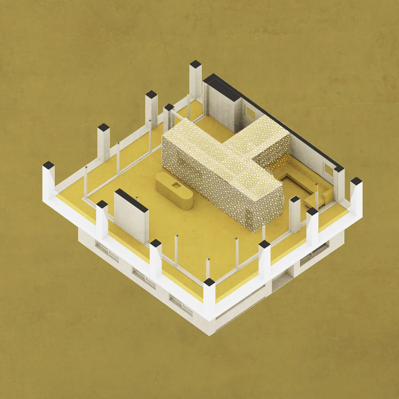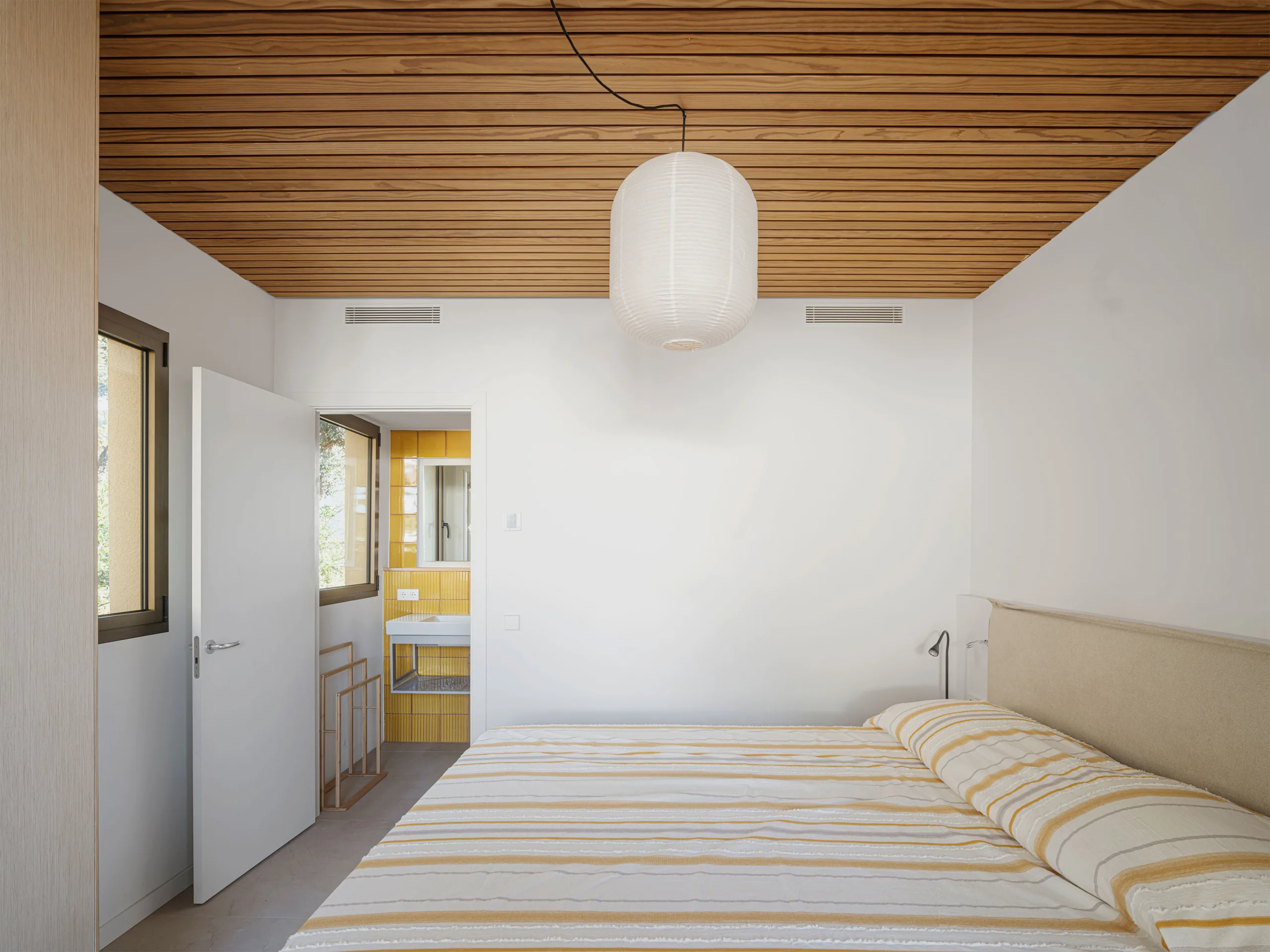 The villa is composed of a simple cube of 11 by 11 meters and two residential floors. On the top floor, an impressive cantilever provides shelter from the burning sun. This floor functions as an all-sided living space: floor-to-ceiling sliding doors all around allow for views on the surrounding landscape. The large horizontal openings in the cantilever frame the landscape like a composed panorama. The cantilever makes vertical sun protection superfluous, guaranteeing generous views and daylight entry.