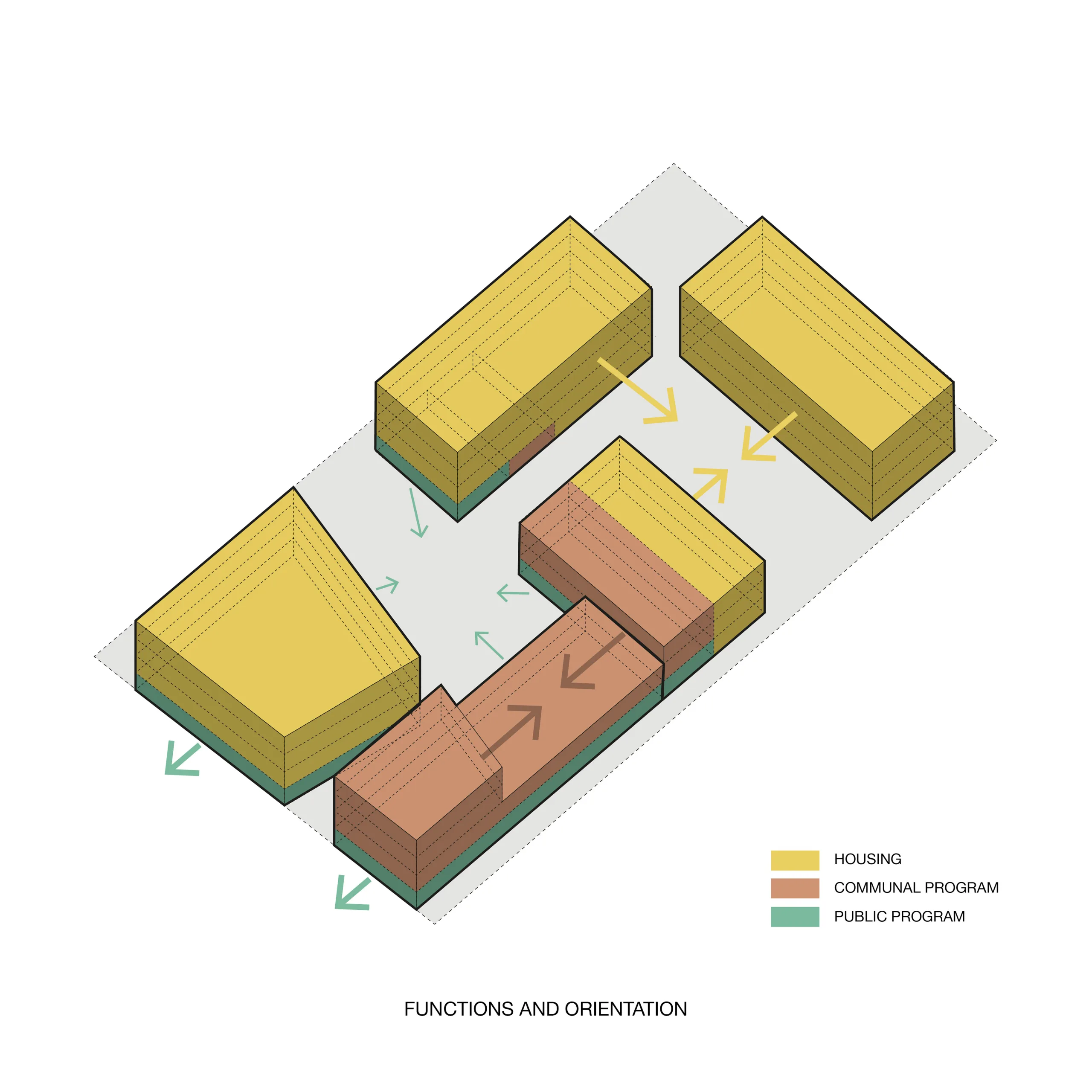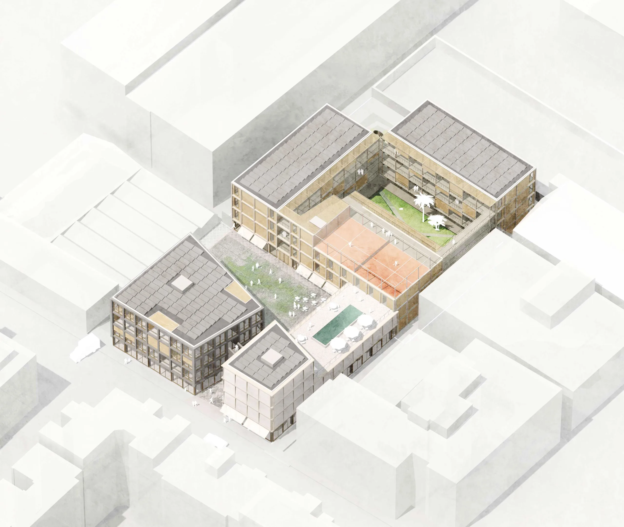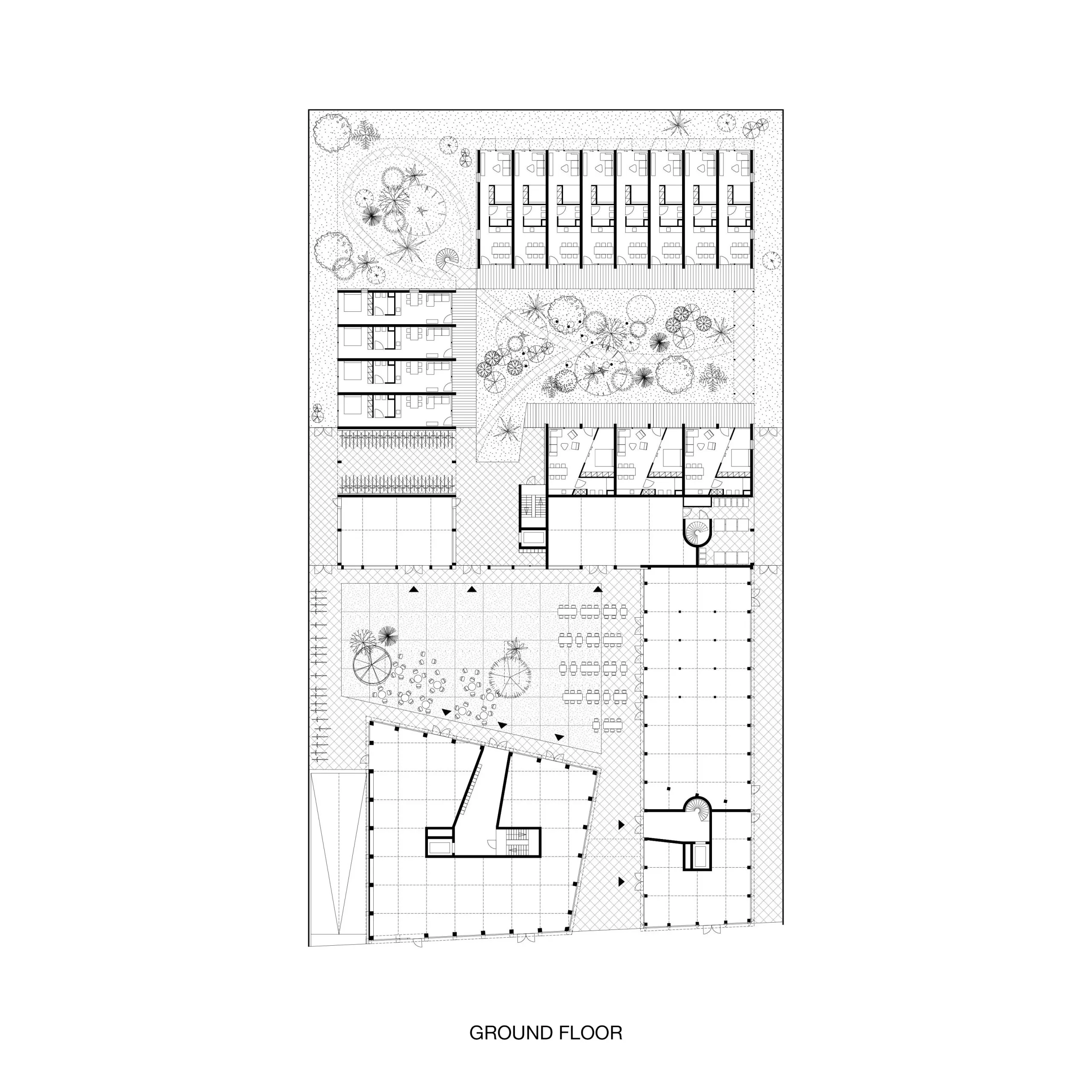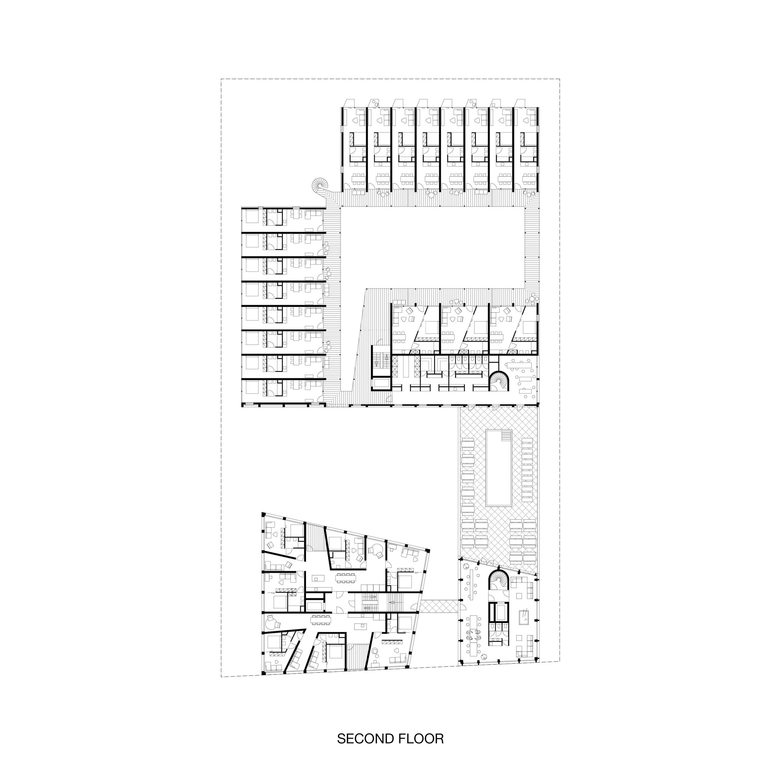 Co-Living Madrid is a proposal with more than 90 homes in the east of Madrid. The design is based on maximizing the possibilities and opportunities of the plot in combination with different forms of housing within a Co-Living concept. Because the location is surrounded by fairly high and closed industrial buildings, the plan has been given an inward-facing character.