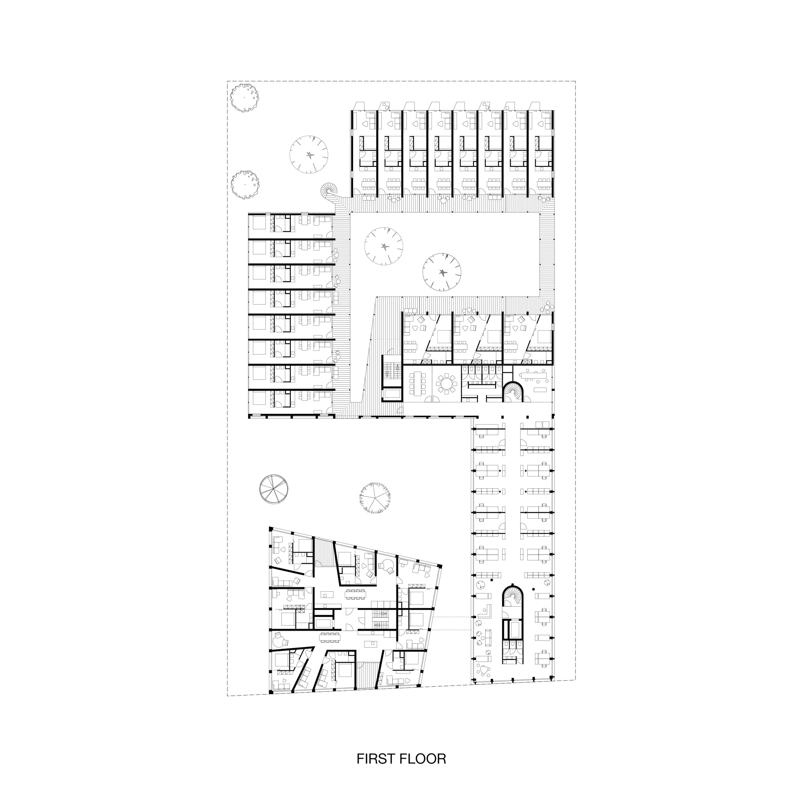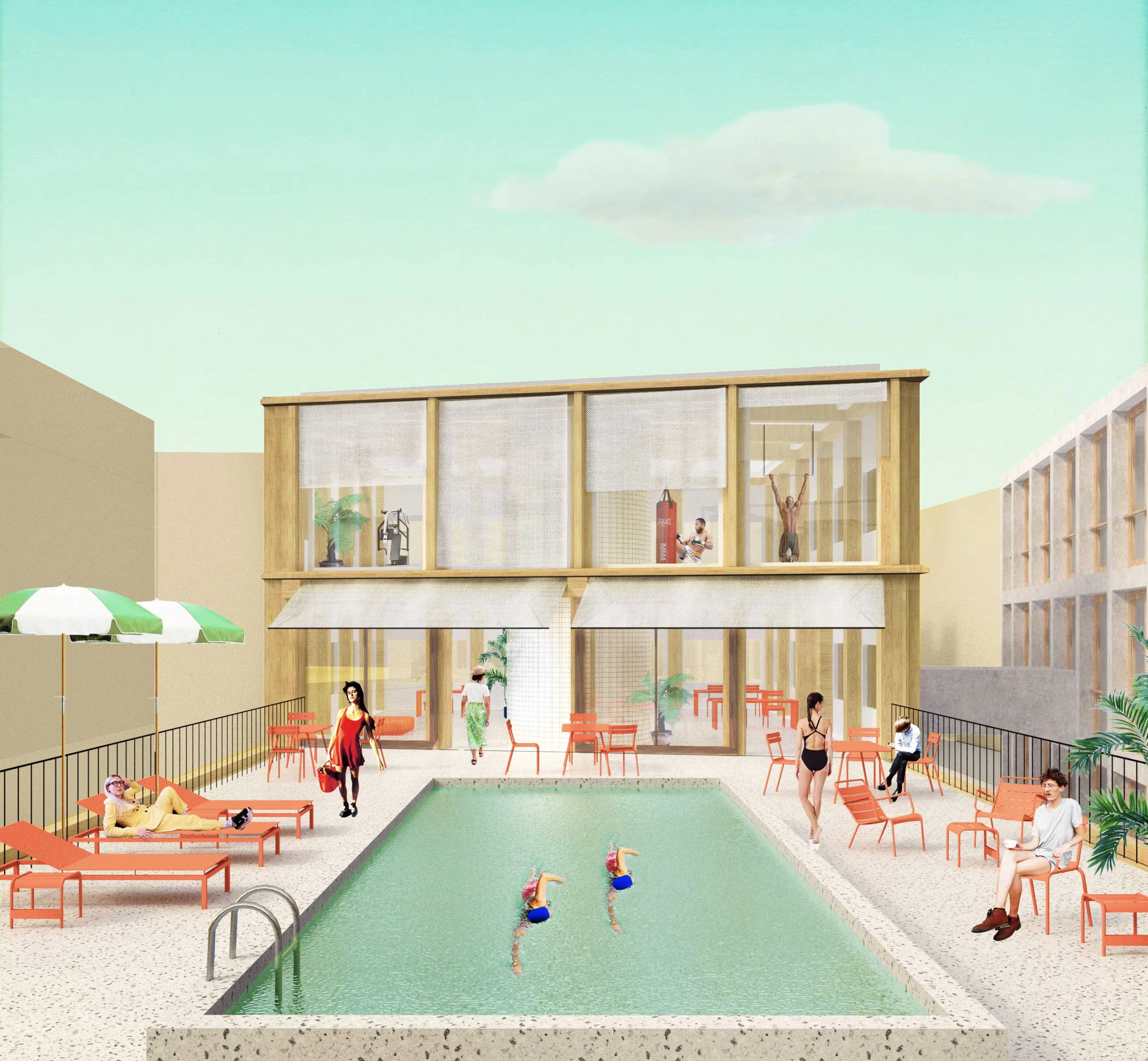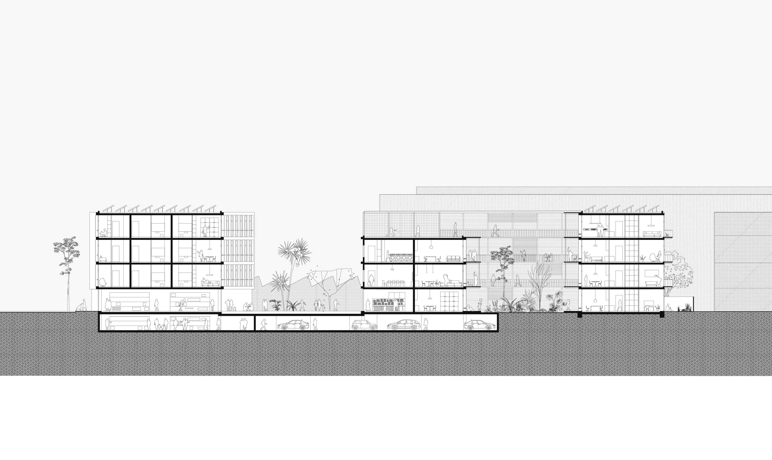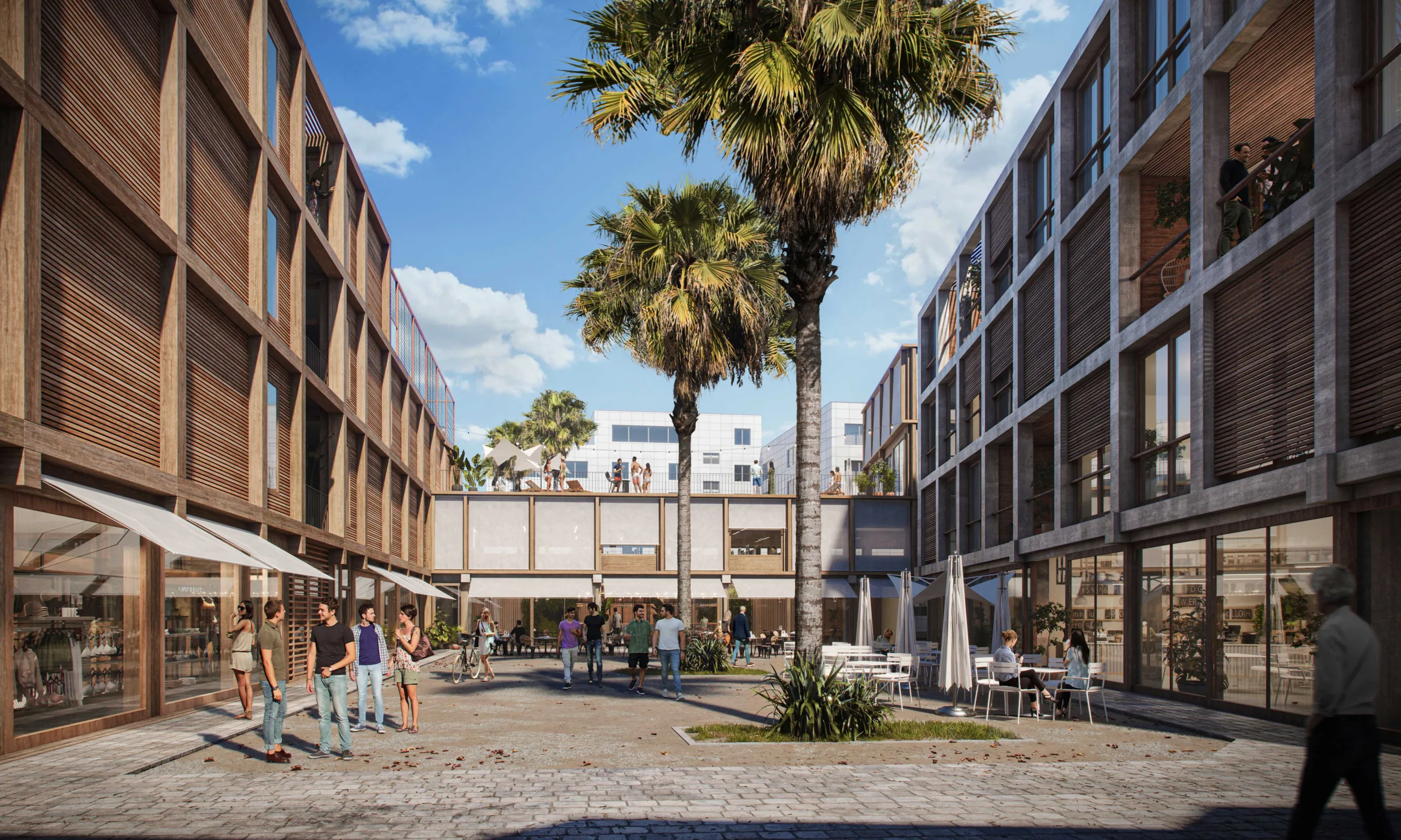 Co-Living Madrid is a proposal with more than 90 homes in the east of Madrid. The design is based on maximizing the possibilities and opportunities of the plot in combination with different forms of housing within a Co-Living concept. Because the location is surrounded by fairly high and closed industrial buildings, the plan has been given an inward-facing character.