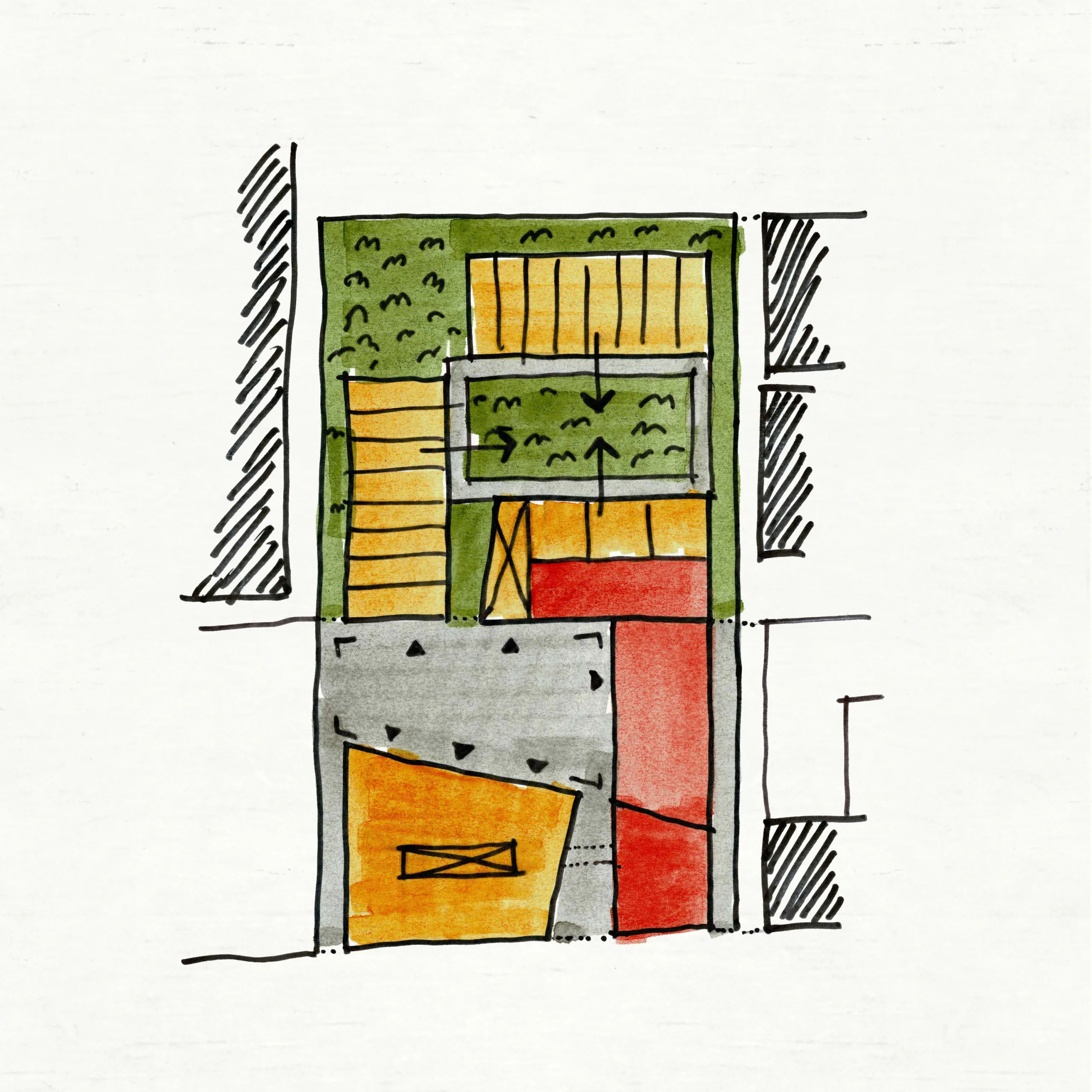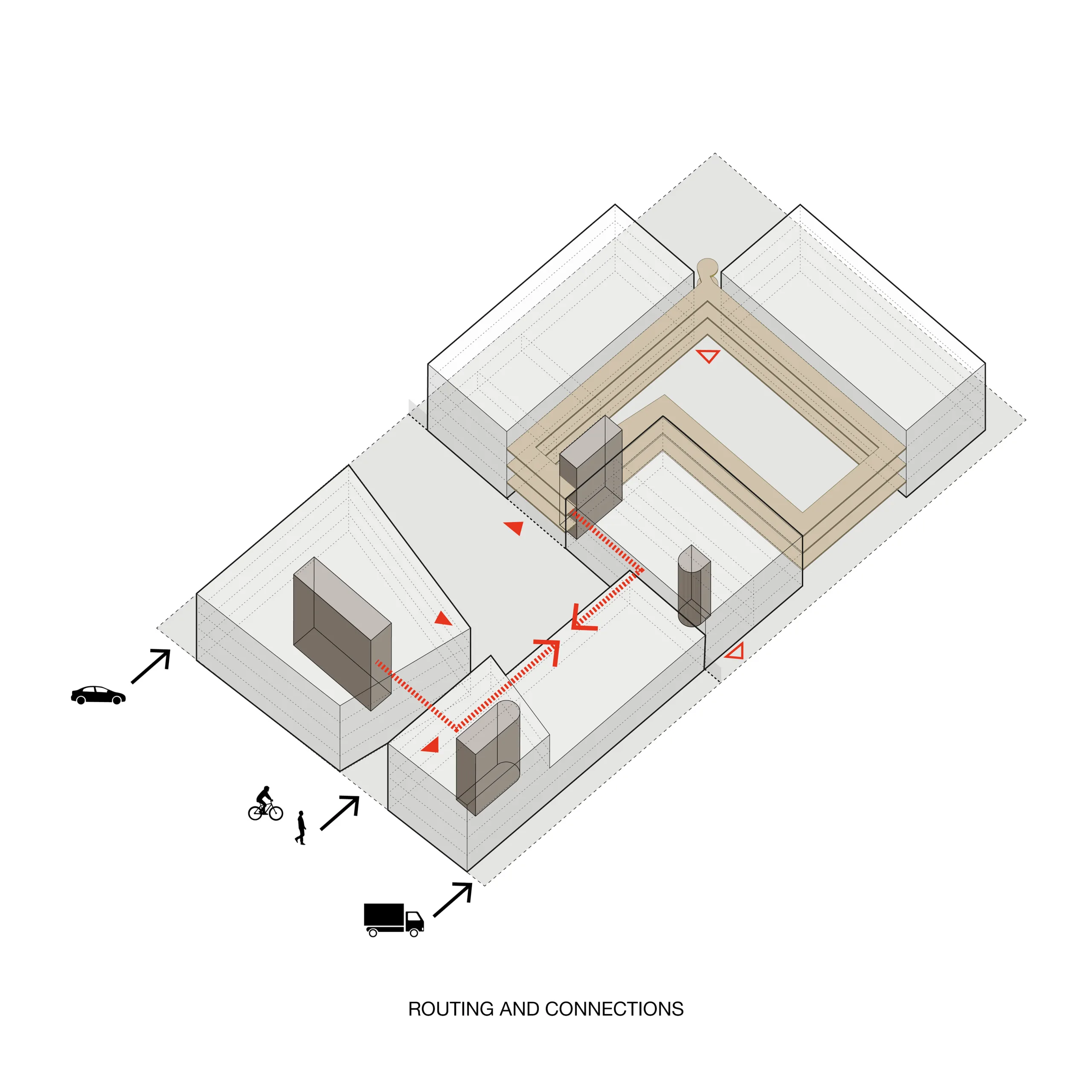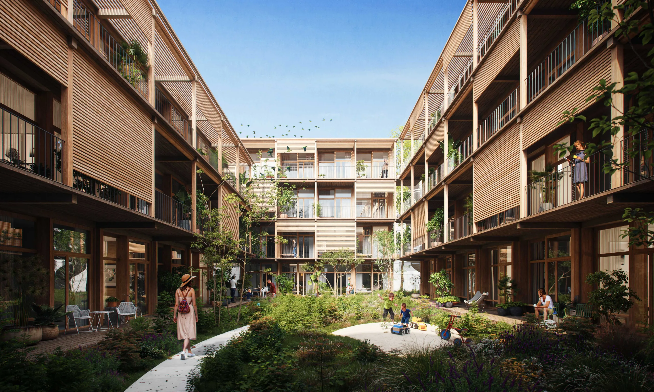 The buildings are positioned around two new courtyards, forming an enclave in the city. Due to the diverse program, squares and housing types, there is a great diversity in the plan. At a local scale, the plan provides for the transition from industrial to human scale and a warm living environment.