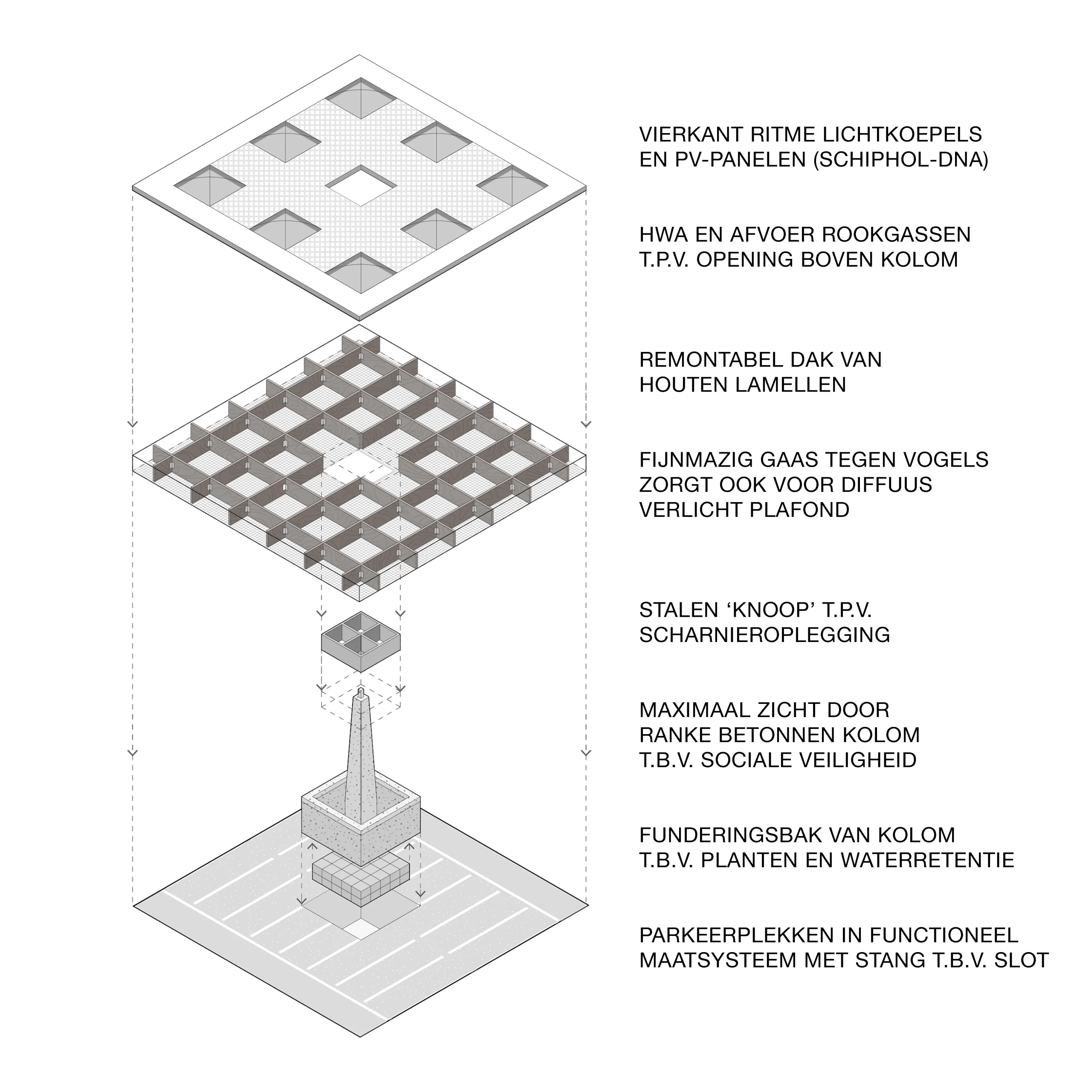 After studying the Schiphol DNA (“always ready but never finished”), we proposed a remountable design that fits the architecture of our main airport. Per modular element, a wooden roof is supported by a central slender column, like an umbrella, maximizing visibility and social safety. A special hinge support makes the roof appear to float above the columns. Rainwater is collected at the columns in a planter and smoke gases can escape here.
