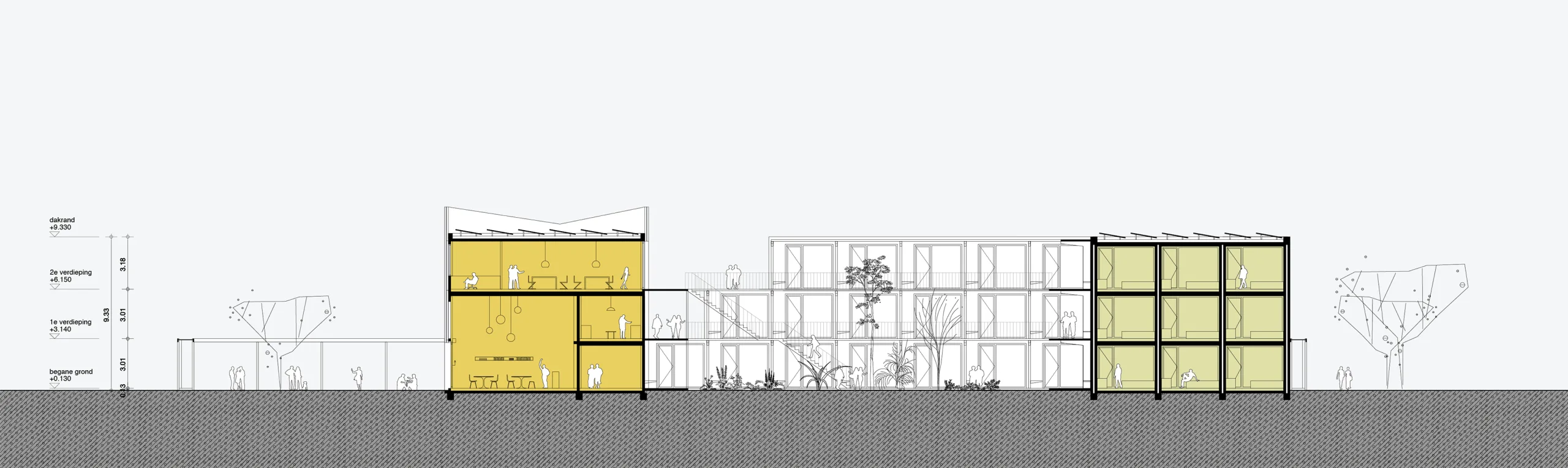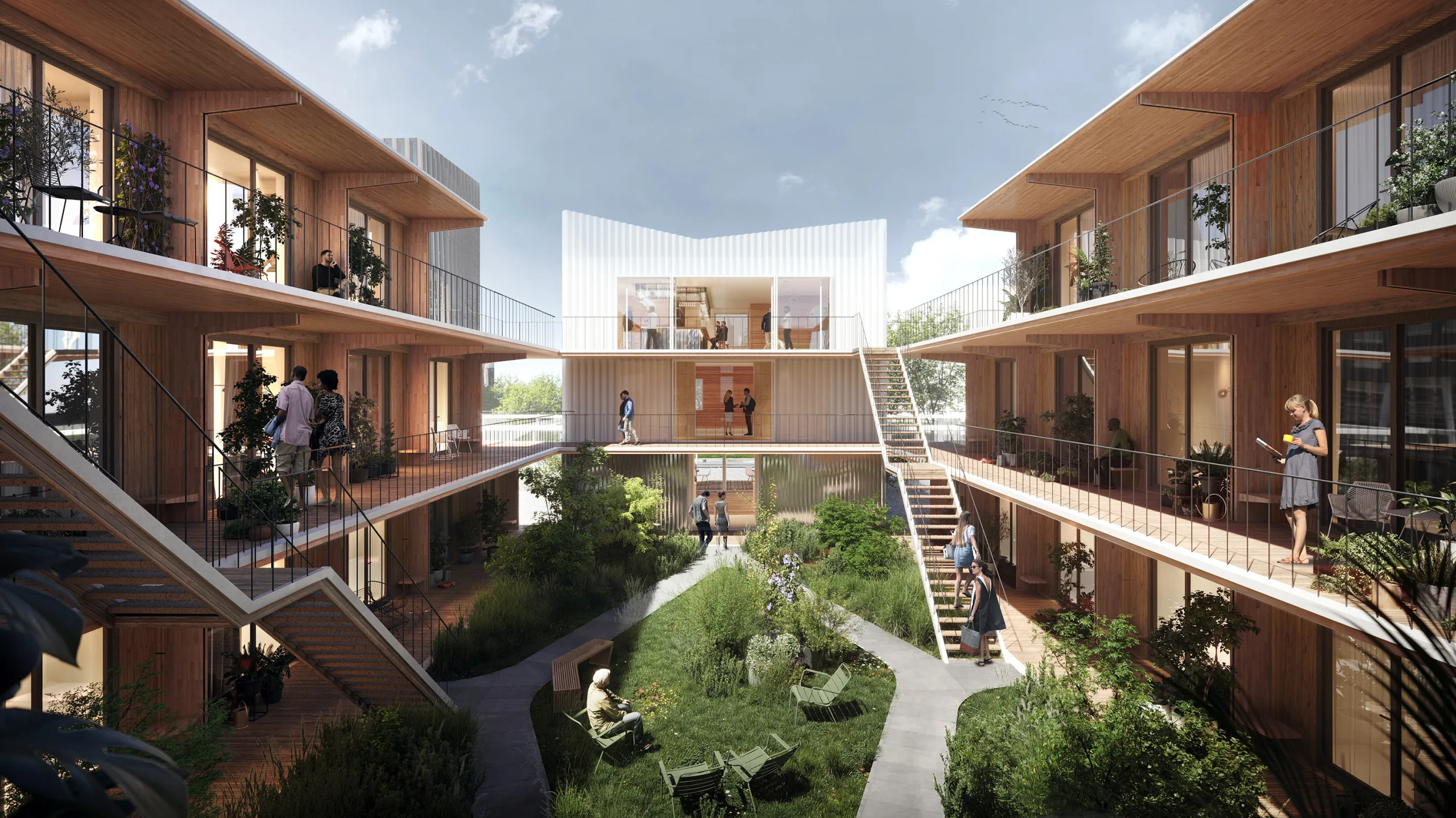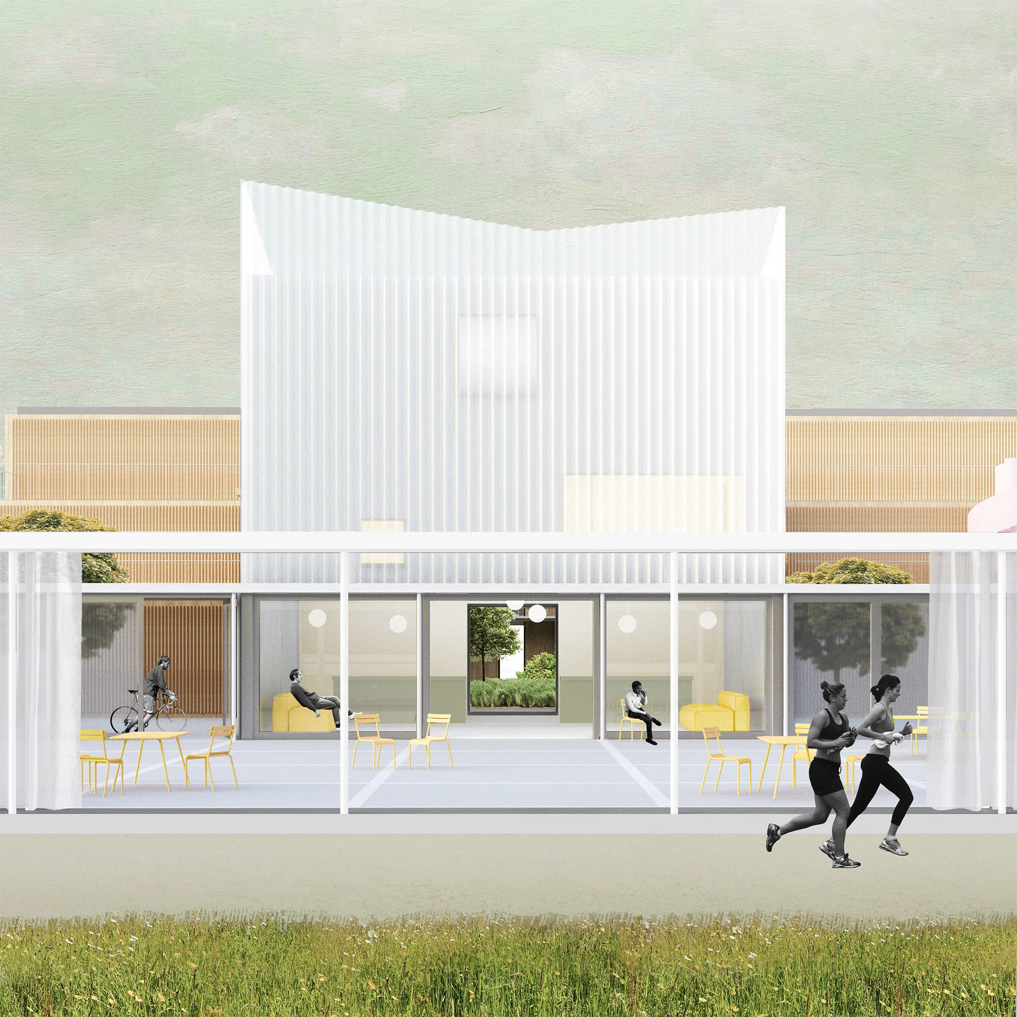 The building blocks of R Way of Living are placed together according to a fixed spatial concept. The spatial concept provides intimacy within the community on the one hand, and connection to the surroundings on the other. Although the size and exact content of the project may vary per location, the spatial concept always remains the same. A multifunctional pavilion in the middle of the complex, centrally located at the intimate courtyard, forms the connecting factor between the courtyard and the public square. A slender steel construction with a transparent mesh provides protection and ensures that the complex blends into its surroundings. The steel framework continues around the square as an open structure, subtly highlighting the public space.