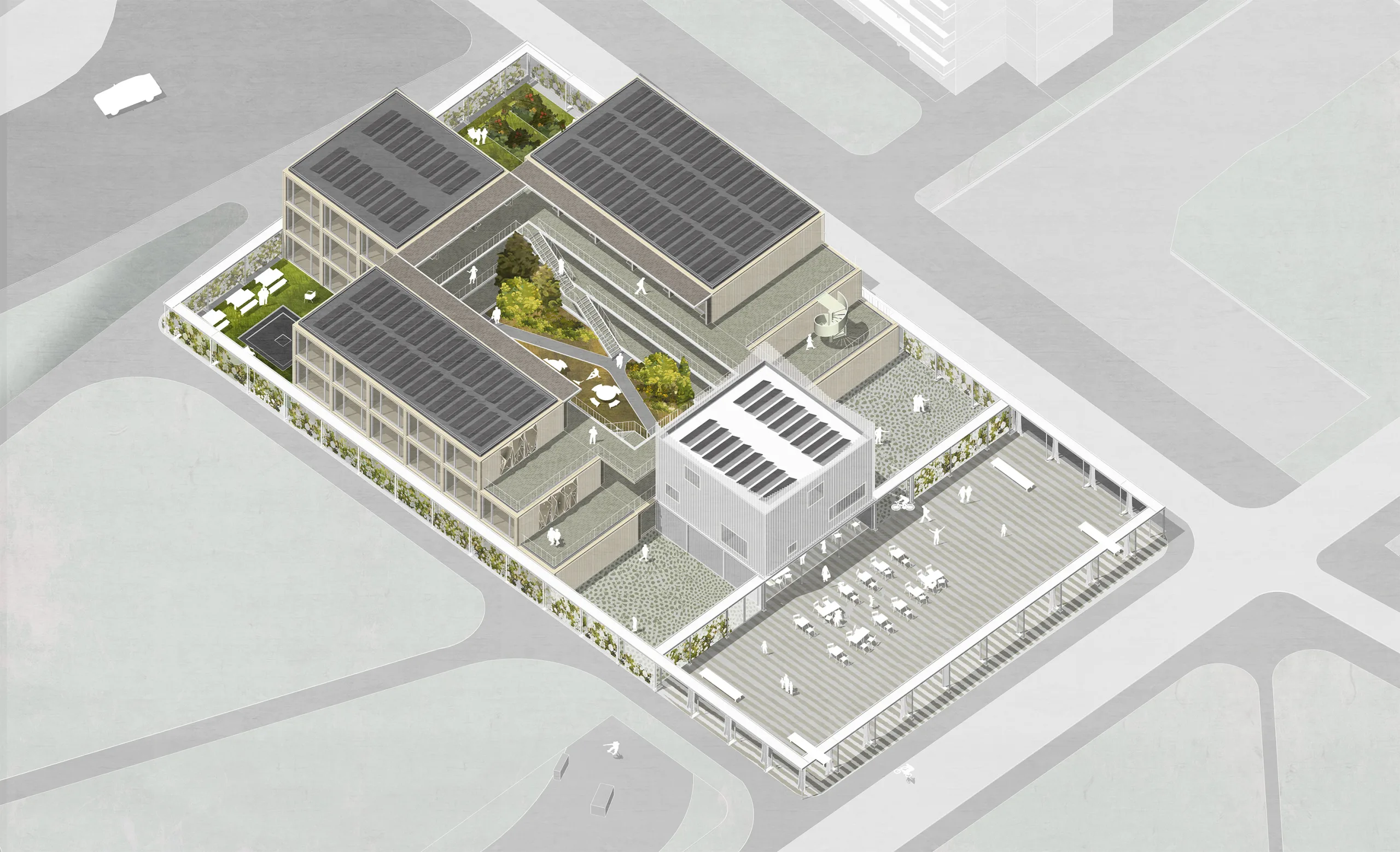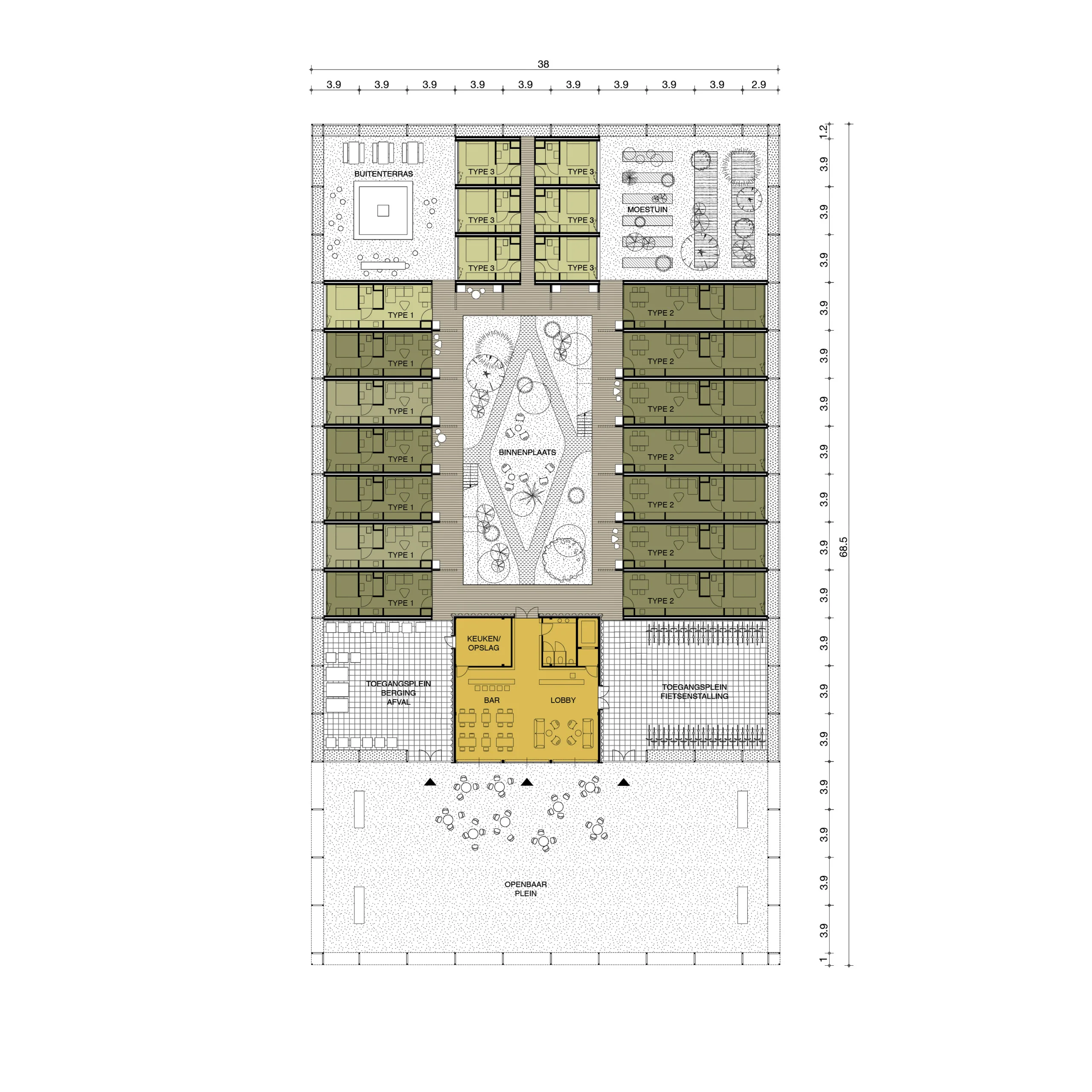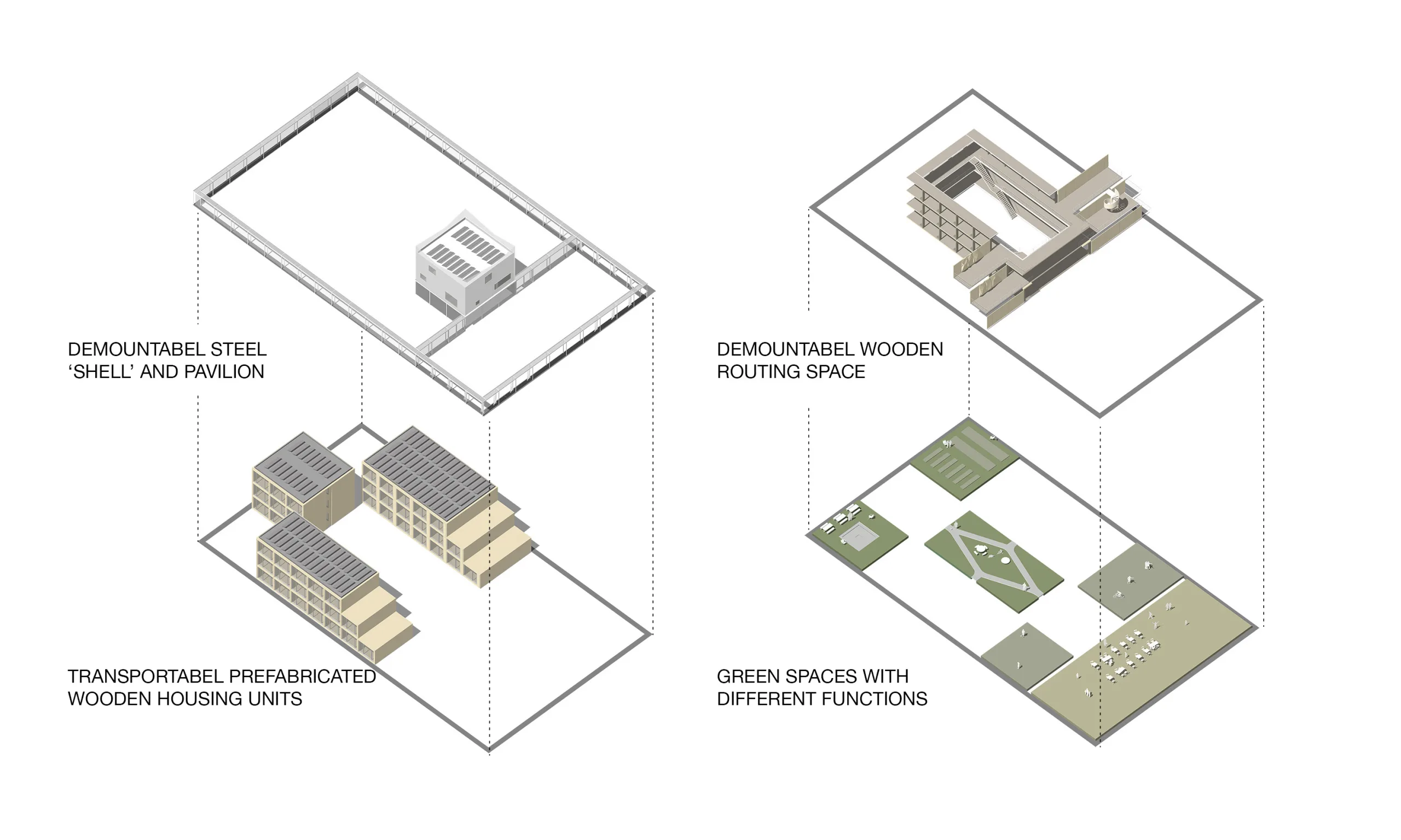 The building blocks of R Way of Living are placed together according to a fixed spatial concept. The spatial concept provides intimacy within the community on the one hand, and connection to the surroundings on the other. Although the size and exact content of the project may vary per location, the spatial concept always remains the same. A multifunctional pavilion in the middle of the complex, centrally located at the intimate courtyard, forms the connecting factor between the courtyard and the public square. A slender steel construction with a transparent mesh provides protection and ensures that the complex blends into its surroundings. The steel framework continues around the square as an open structure, subtly highlighting the public space.