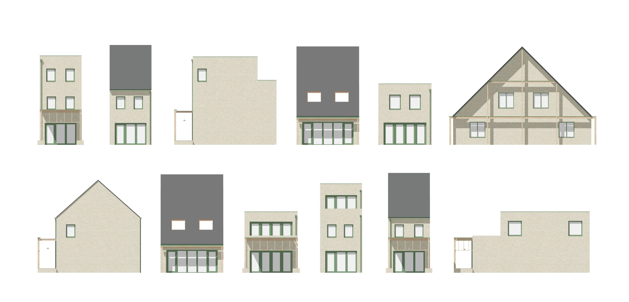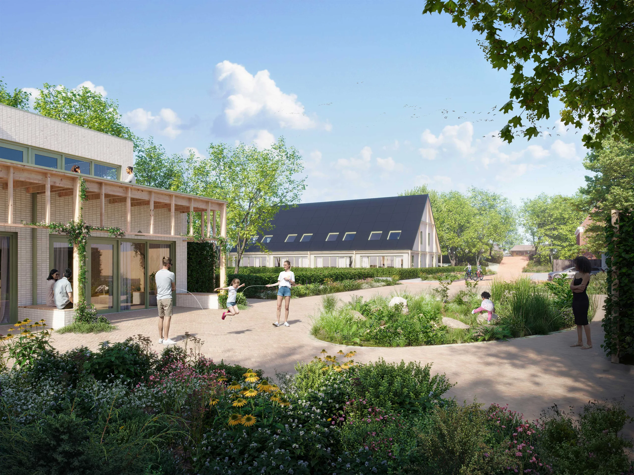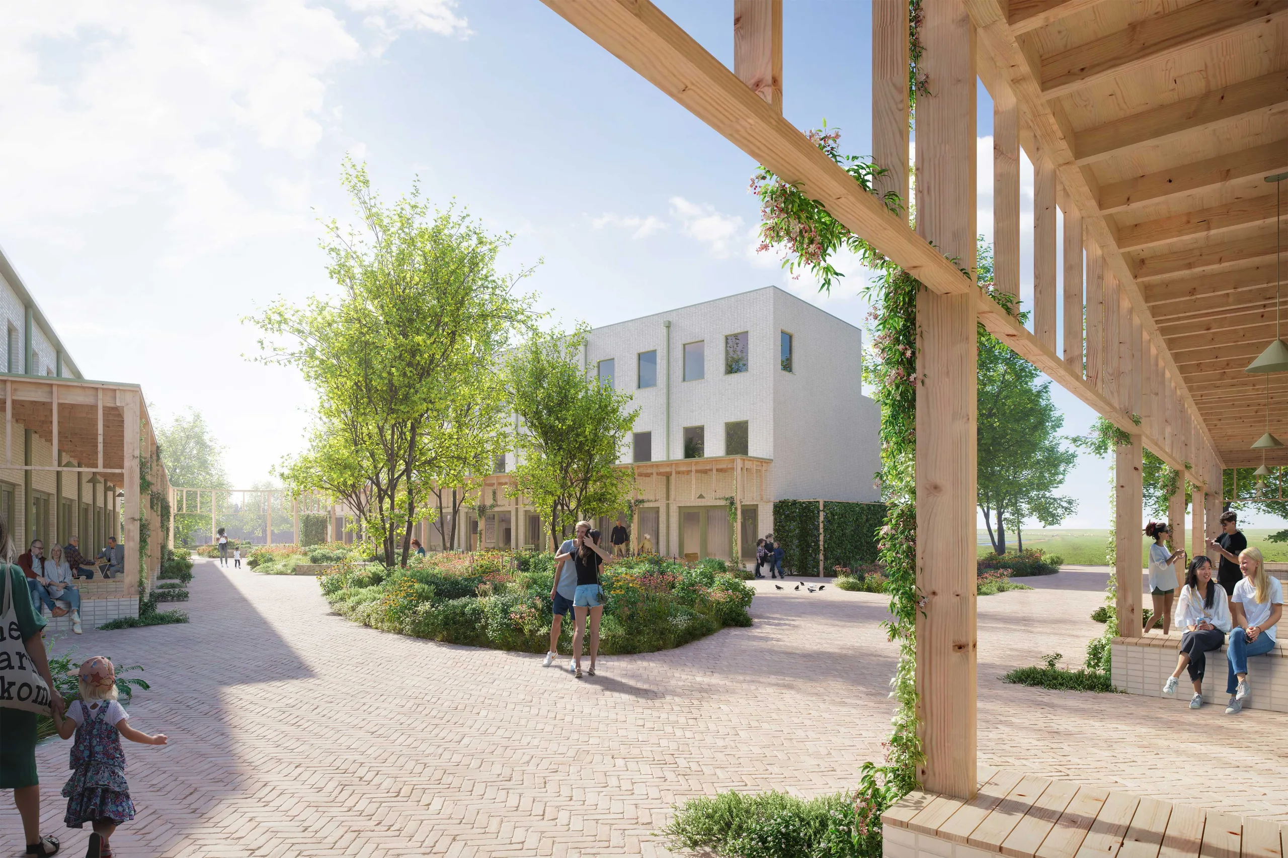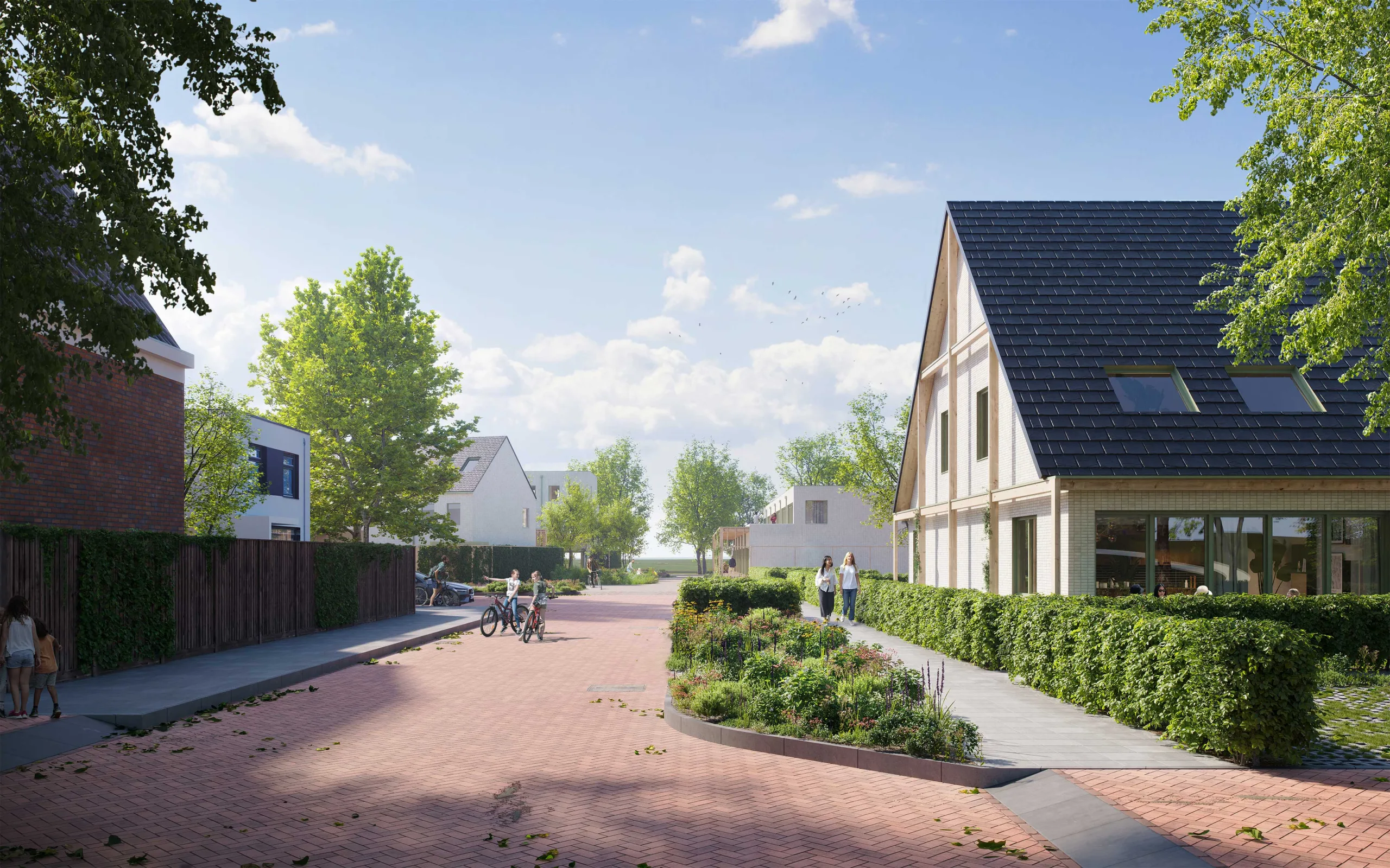 ‘Het Wouwse Hof’ is our design for a sustainable development with over 30 affordable homes on the edge of Rijnsaterwoude; a small village on the Braassemer lake. With a variety of affordable housing types, it accommodates different target groups, from young to old, stimulating a natural ‘flow’ of residents in the village. Where the urban design encourages playing outside, a sense of community and meeting each other, the architecture follows the rural housing types of the area. With the addition of a pergola as a transition zone, the buildings are visually connected and the entrance feels like a generous connection between private and public areas.